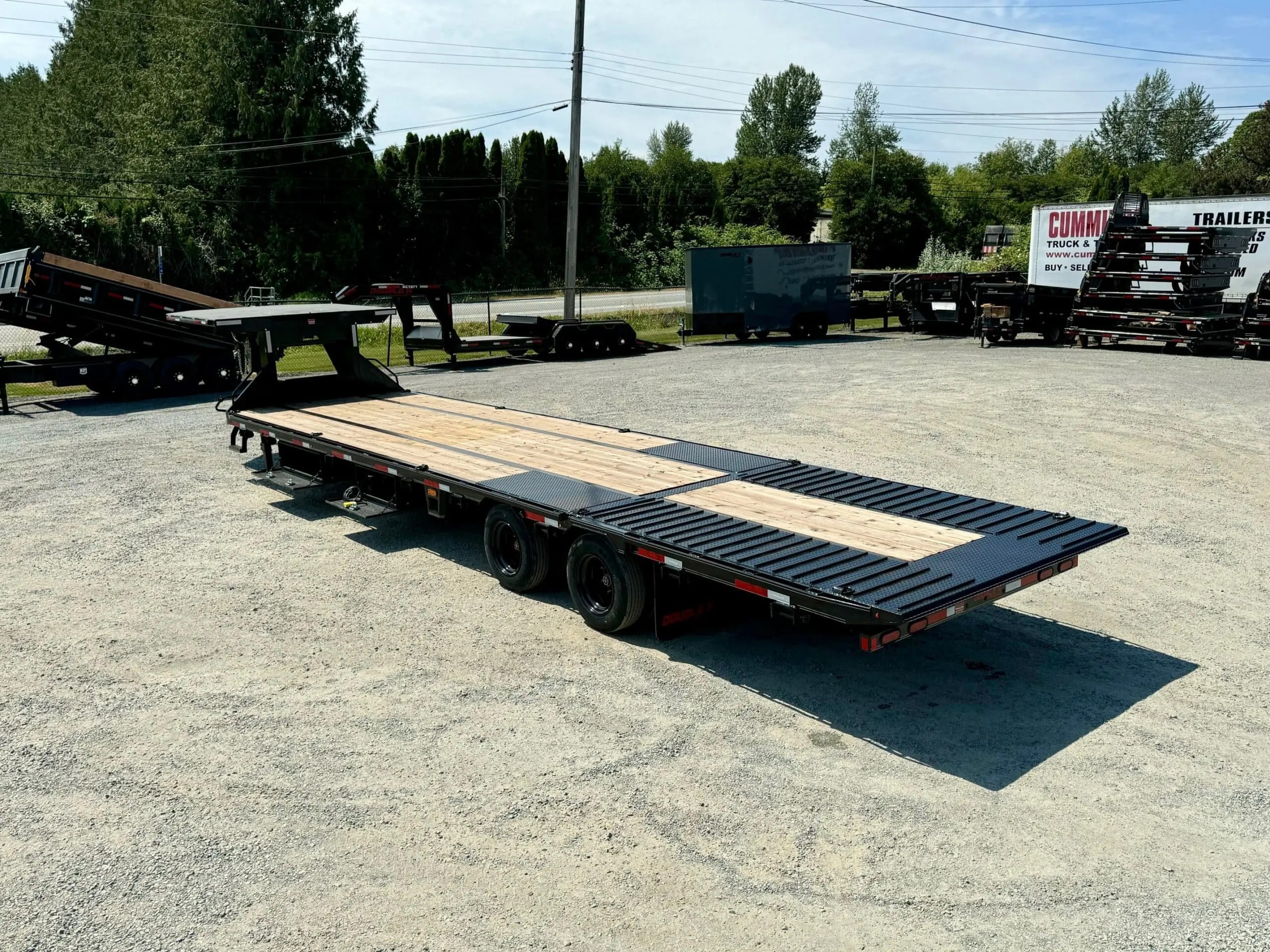 & Free Shipping32ft deck-over trailer for sale featuring a hydraulic beavertail and heavy-duty construction, ideal for hauling equipment and large loads.
