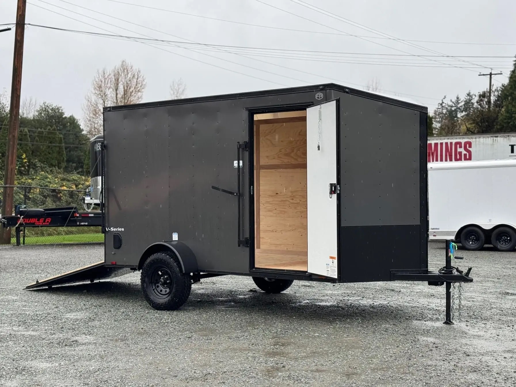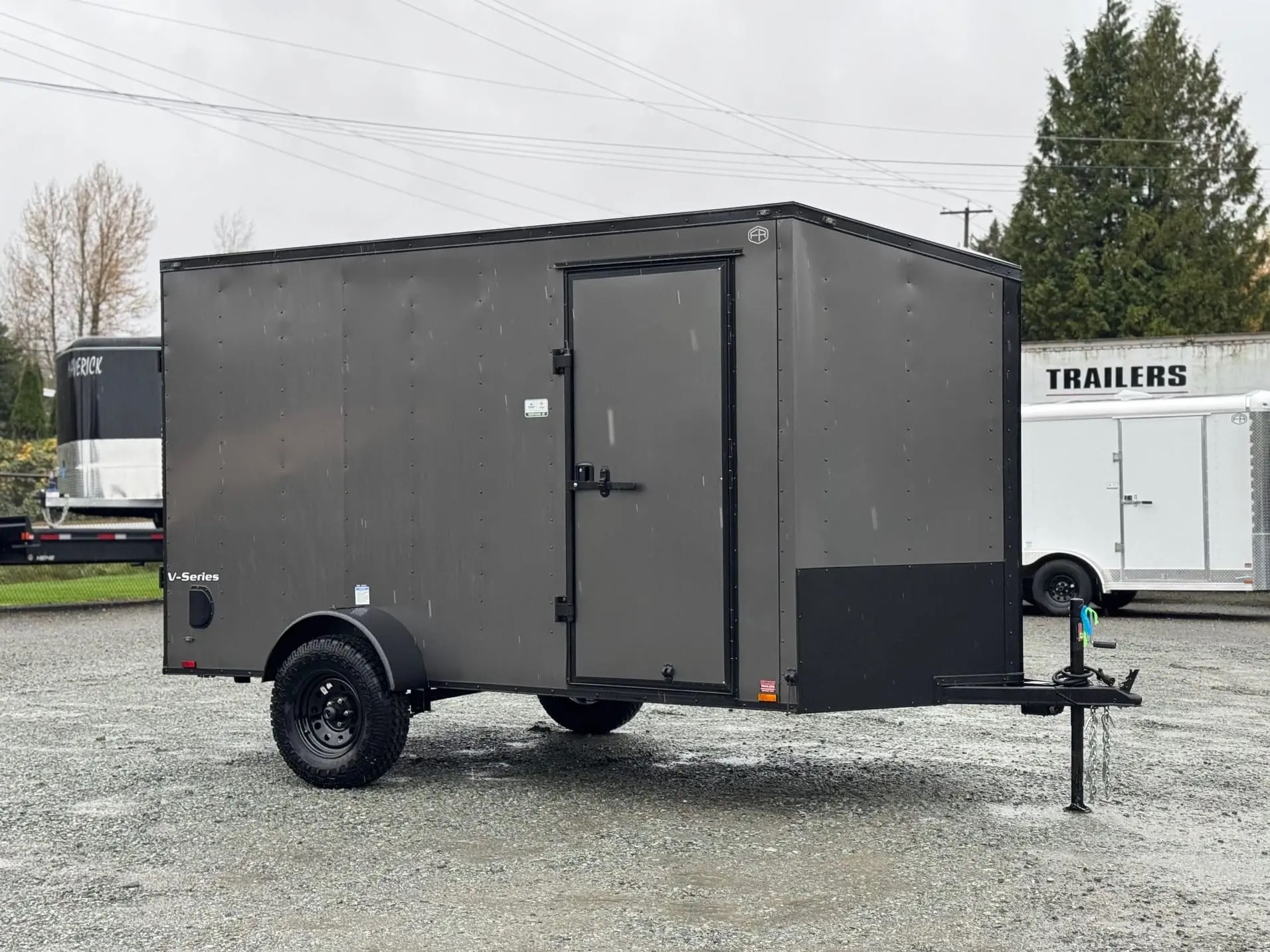 6×12 V-Series enclosed cargo trailer for sale with off road package and ramp door is a compact and durable trailer designed for hauling equipment and materials while protecting cargo from weather.